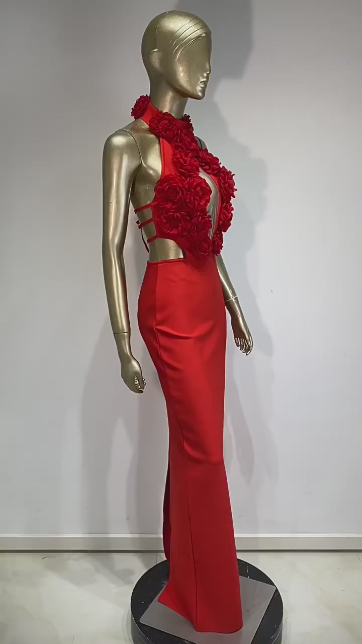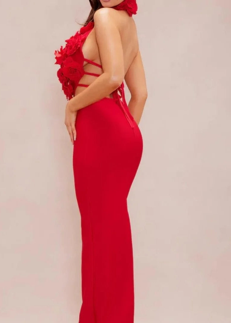 Scarlet Flora Halter Maxi Dress is designed to make a statement at formal events, galas, and special evenings. The halter neckline is framed with dimensional floral appliqués that draw attention upward, while the sculpted bodice enhances the natural shape. An open back with adjustable tie straps allows for a personalized fit and adds a striking visual finish.