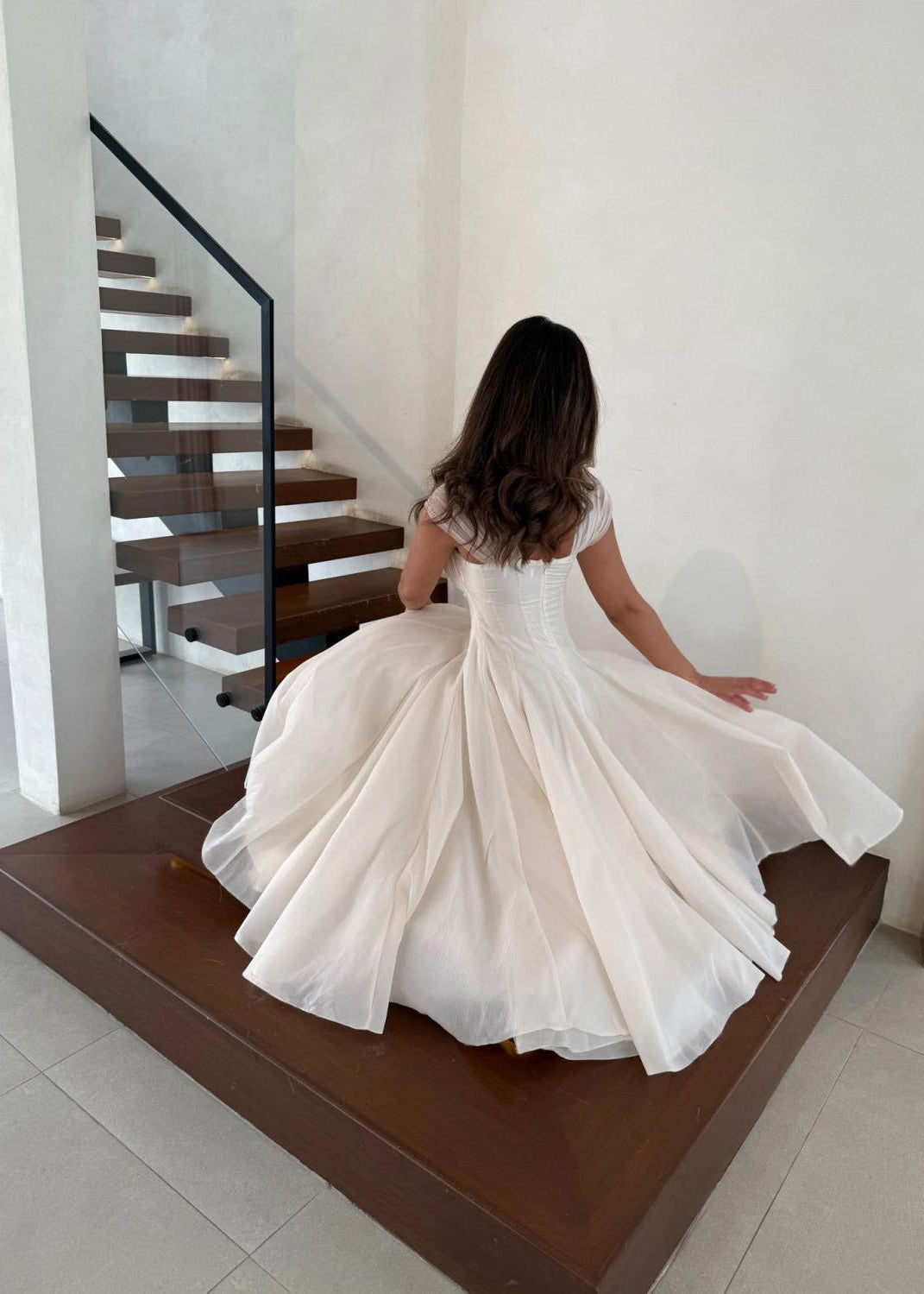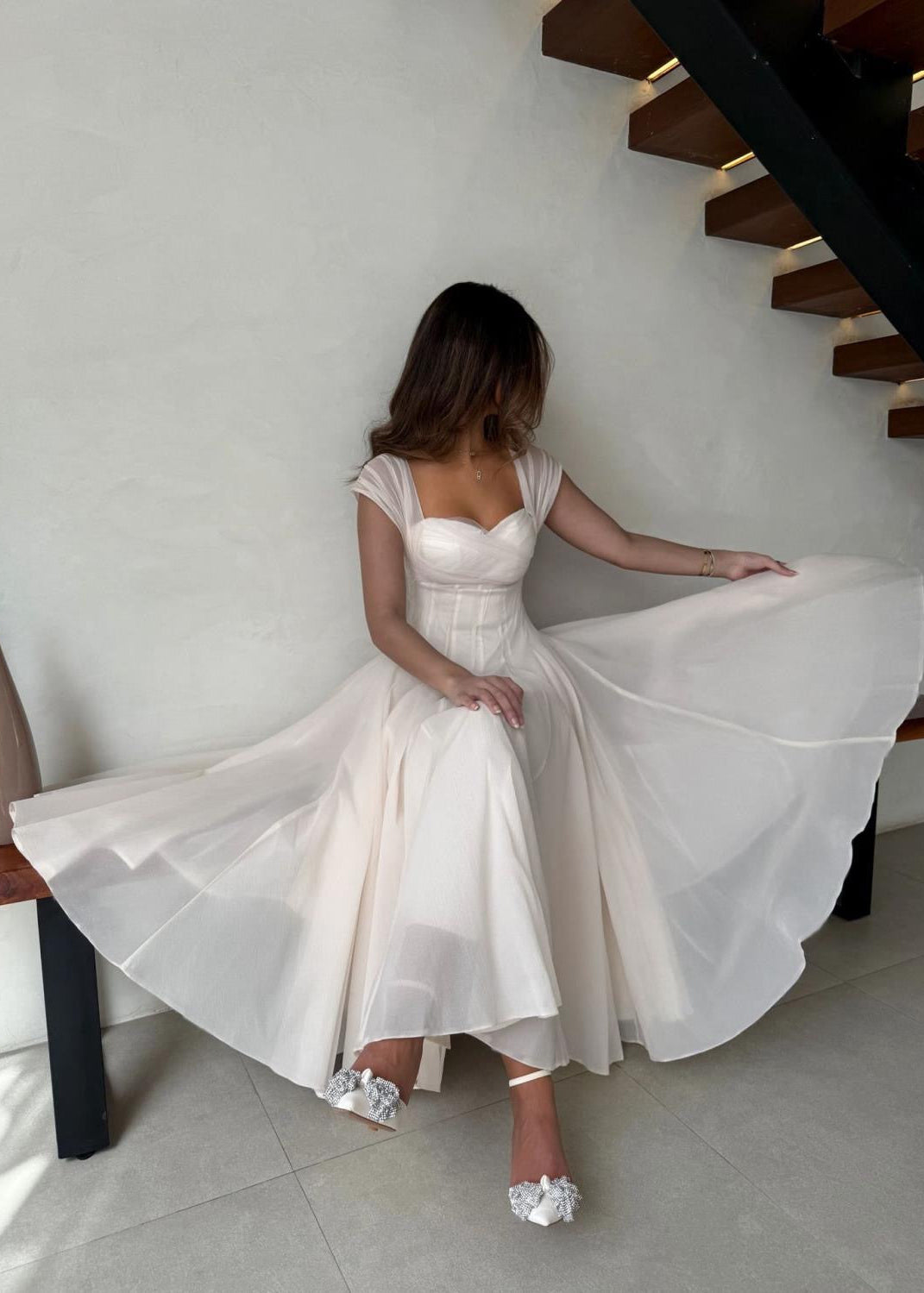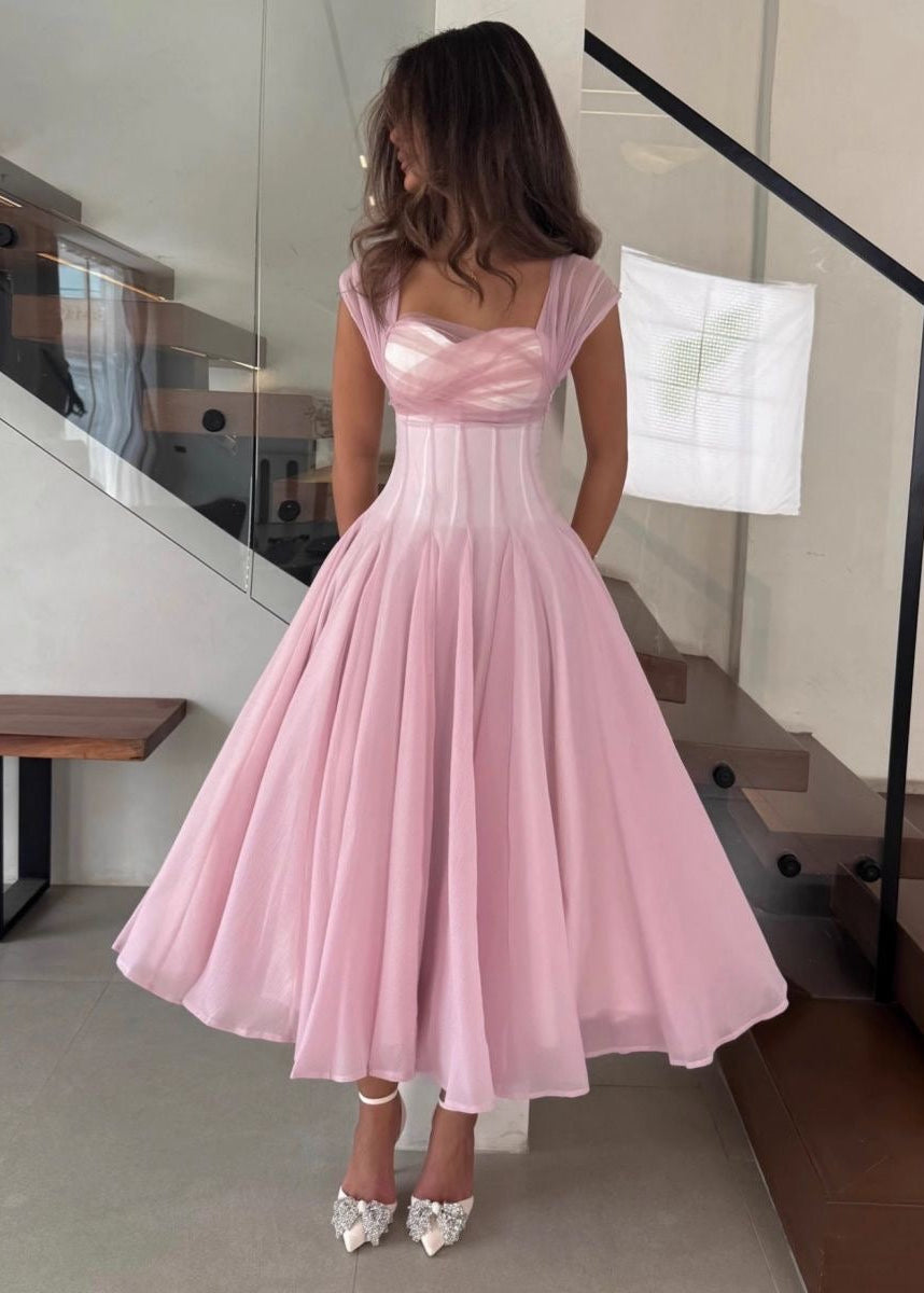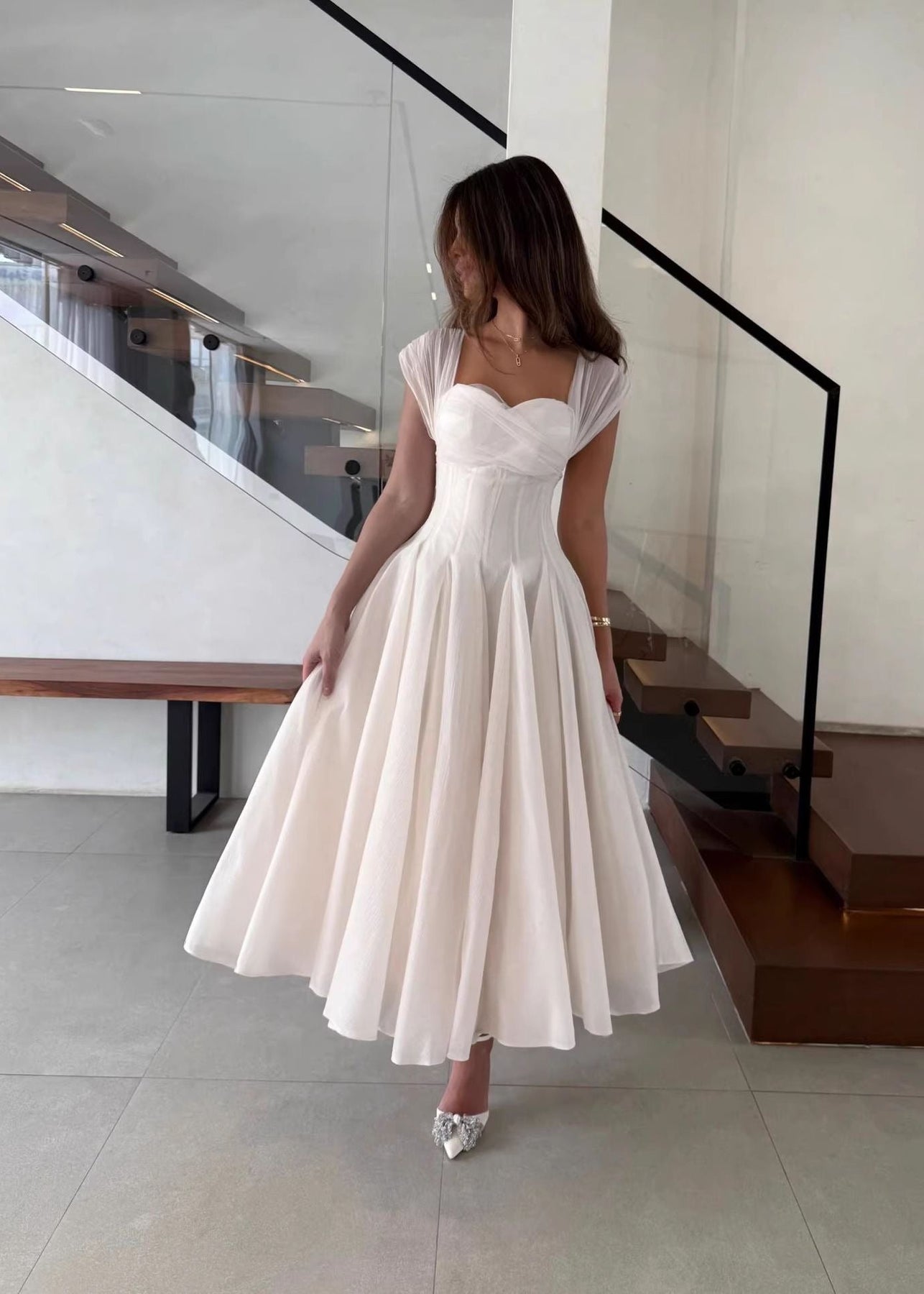 Rosaline Corset Midi Dress – Structured Waist Flowy A-Line Evening Dress features a sculpted bodice with a defined corset structure that enhances the waistline and creates a balanced, feminine silhouette. The softly draped neckline adds dimension, while the fitted waist transitions into a full, airy skirt that moves beautifully with every step.