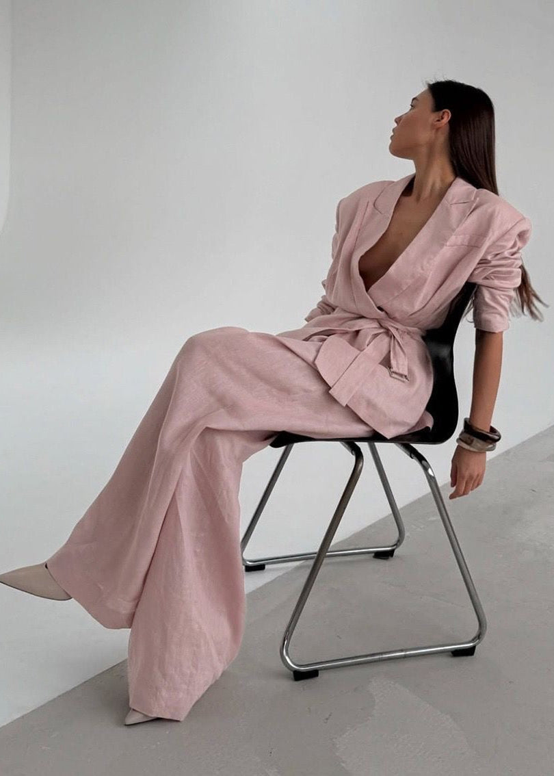 Roselle Linen Tailored Set – Relaxed Blazer & Wide-Leg Pants Suit is designed for a clean, modern silhouette with an effortless feel. The structured blazer features a deep V neckline and a matching belt that allows you to define the waist or wear it loose for a relaxed look.