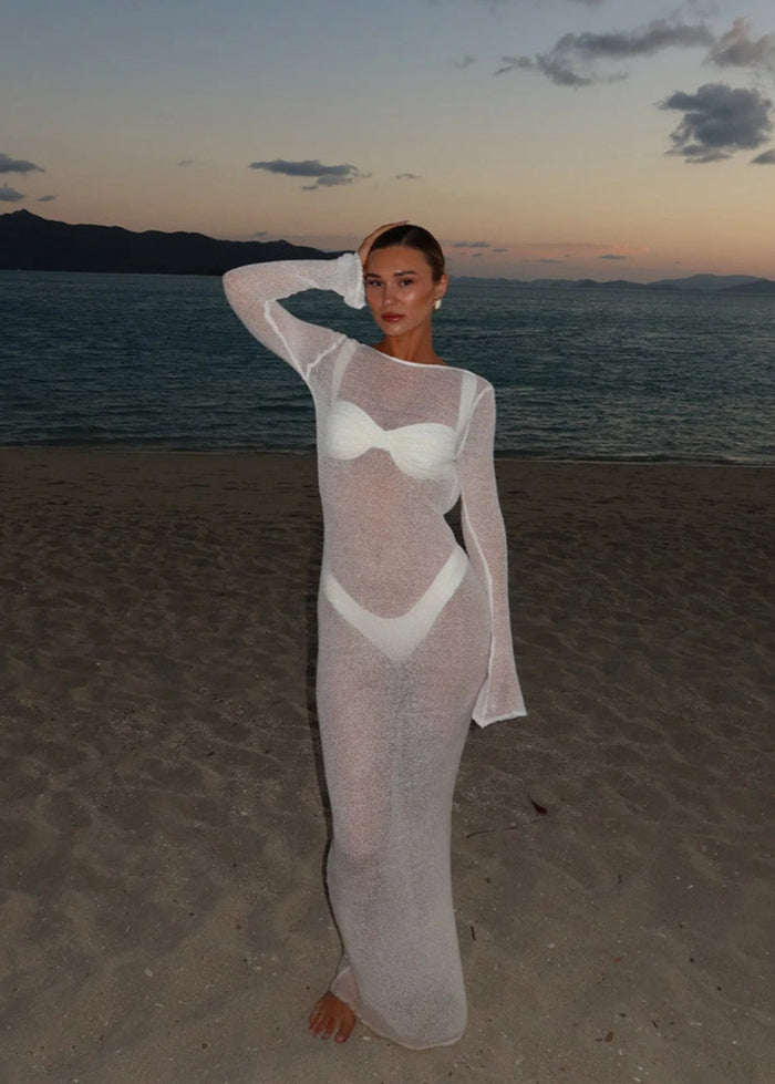 El Azure Mirage es un conjunto de playa de 3 piezas que combina un estilo audaz con funcionalidad lista para vacaciones. Incluye un vestido de malla de manga larga transparente, un top de bikini bandeau acolchado y una braguita de bikini a juego, creando un look impactante para cualquier destino costero. El vestido cubre con un flujo sin esfuerzo gracias a su silueta hasta el suelo y su escote pronunciado y dramático, mientras que el bikini ofrece soporte ligero y cobertura mínima. Ideal para relajarse junto a la piscina, escapadas en yate o días en clubes de playa.
