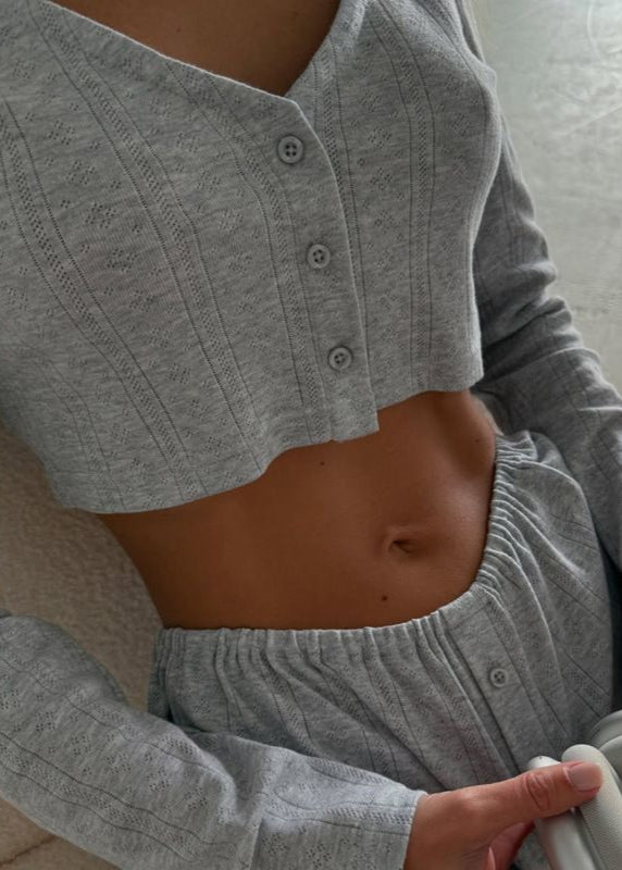 El conjunto de descanso Heather Knit con botones al frente combina comodidad acogedora con un ajuste favorecedor, perfecto tanto para relajarse en casa como para salidas casuales. Confeccionado con un tejido de punto suave y transpirable, este conjunto de dos piezas incluye una parte superior cropped de manga larga con diseño de botones al frente y pantalones cortos a juego de cintura alta con banda elástica para facilitar su uso. El sutil patrón de punto vertical añade textura y estilo, mientras que el material ligero asegura comodidad durante todo el día.