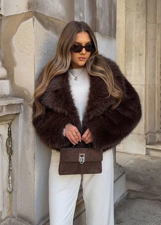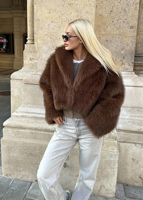 The Marceline Cropped Faux Fur Jacket adds refined texture and warmth to your cold-weather look. Crafted from premium faux fur with a soft satin lining, this piece features a cropped silhouette, wide lapel collar, and slightly loose sleeves for a modern yet cozy feel. Perfect for pairing with high-waisted trousers or dresses, it offers both comfort and statement appeal for casual outings or evening wear.
