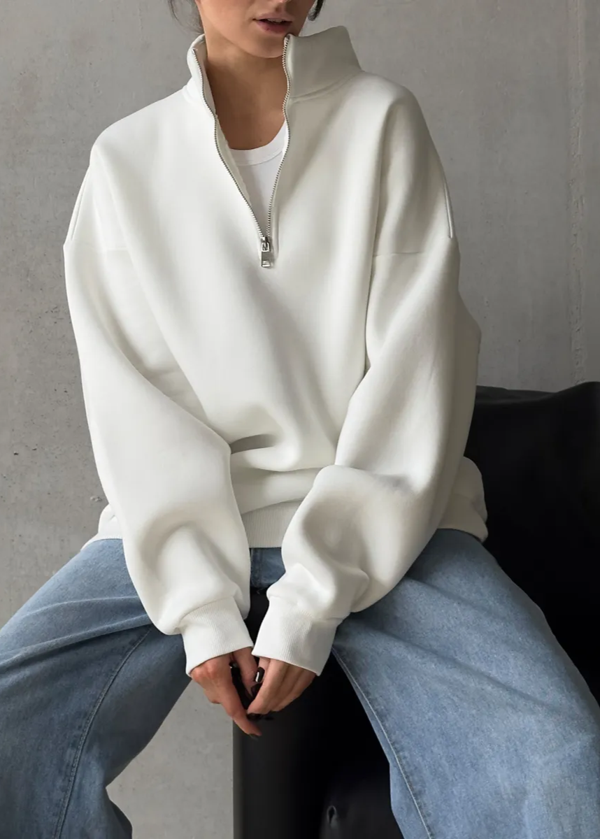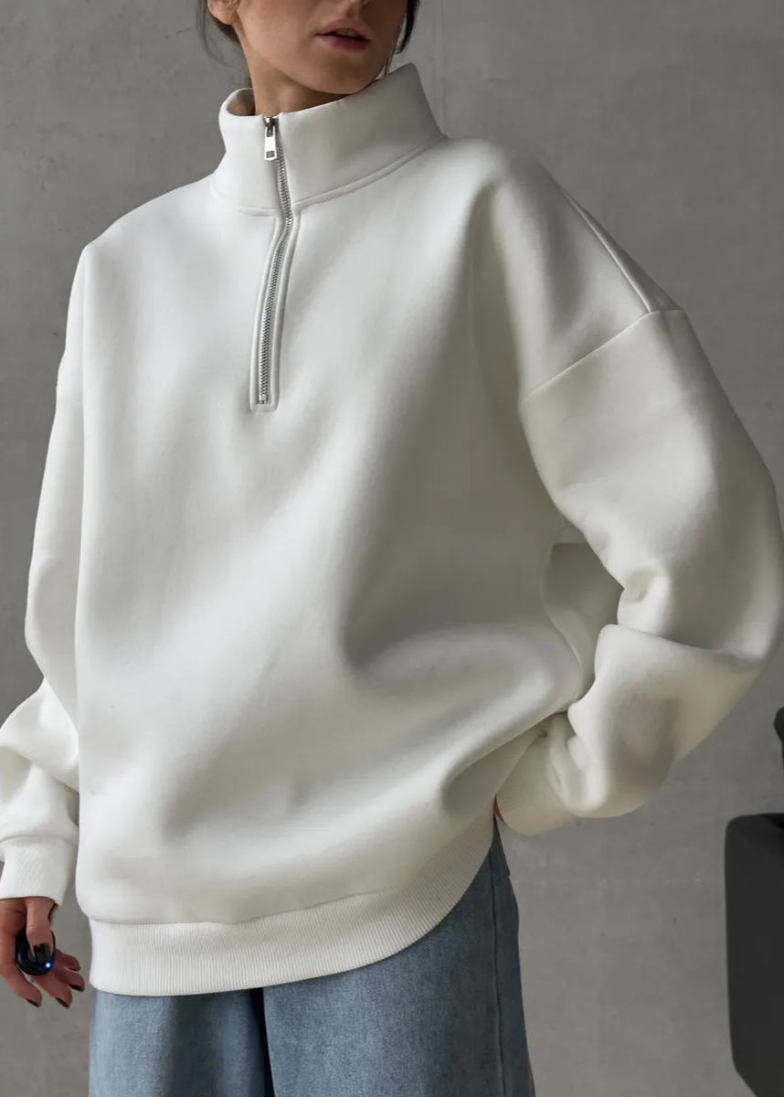 The Ivory Drift sweatshirt delivers a clean, minimalist aesthetic with an oversized fit and elevated details. Cut from thick fleece-backed cotton-blend fabric, it features a half-zip front, tall stand collar, and dropped shoulders for a modern silhouette. The wide sleeves and soft interior make it ideal for layering on cooler days. Whether zipped up for a sharp edge or open for a relaxed feel, this pullover is an effortless essential.