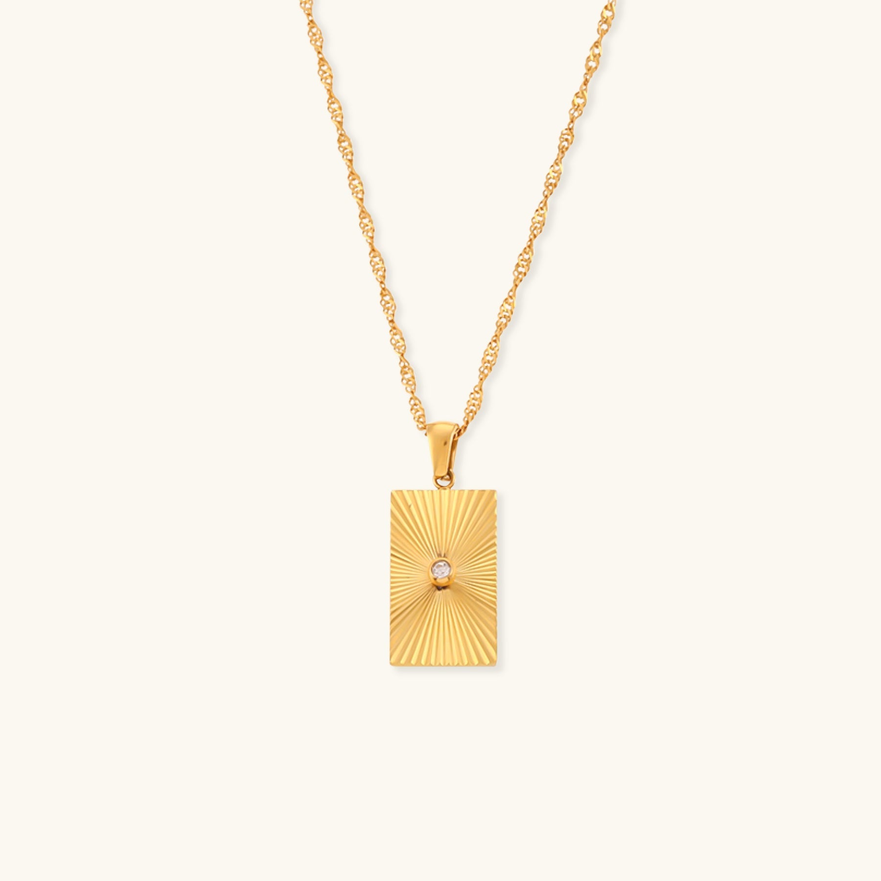 De Radiant Horizon Gouden Ketting is een verbluffende mix van elegantie en modern design. Met een slank rechthoekig hanger versierd met een centrale diamant simulant, voegt dit stuk een verfijnde sprankeling toe aan je look. Gemaakt van 18K waterproof goud, biedt het zowel luxe als duurzaamheid, perfect voor zowel speciale gelegenheden als dagelijks gebruik. Verhoog moeiteloos je stijl met deze veelzijdige en opvallende ketting.