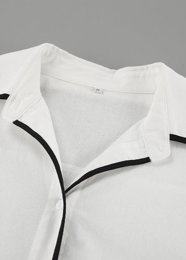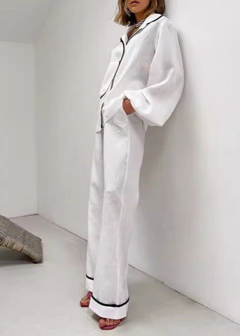 Noa - Contrast Piped Lounge Set mengt moeiteloze comfort met verfijnde elegantie. Ontworpen met een relaxte button-up shirt met een statementzak en contrast piping, is deze set zowel chic als comfortabel. De bijpassende wijde broek biedt vloeiende beweging en een gepolijste afwerking, waardoor het perfect is om thuis te loungen of in stijl naar buiten te gaan. Gemaakt van ademende, lichte stof, is deze set een must-have voor degenen die houden van verfijnde eenvoud.