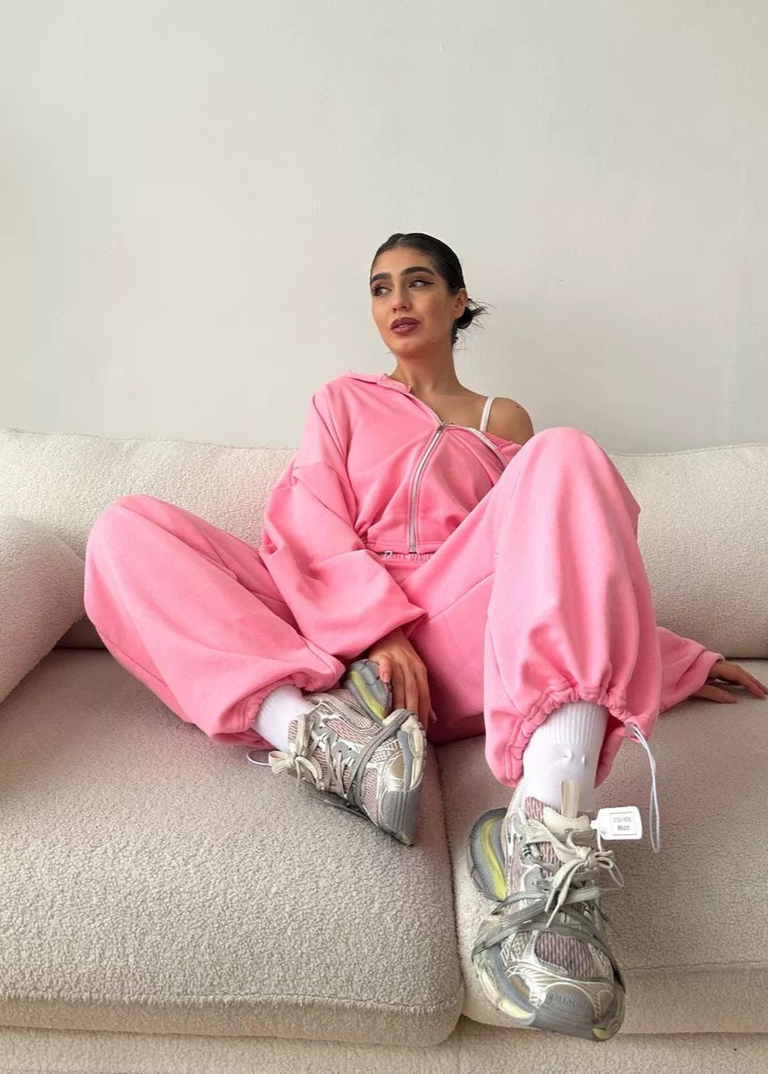 Bubblegum Pink Cropped Zip Hoodie and Wide-Leg Pants Set brings a bold, playful touch to everyday wear. The hoodie features a modern cropped cut with an easy front zip and wide sleeves, while the high-waist pants offer an adjustable elastic waistband for a relaxed, flattering fit. Crafted from soft, medium-weight fabric, this two-piece set ensures comfort for lounging or casual outings.