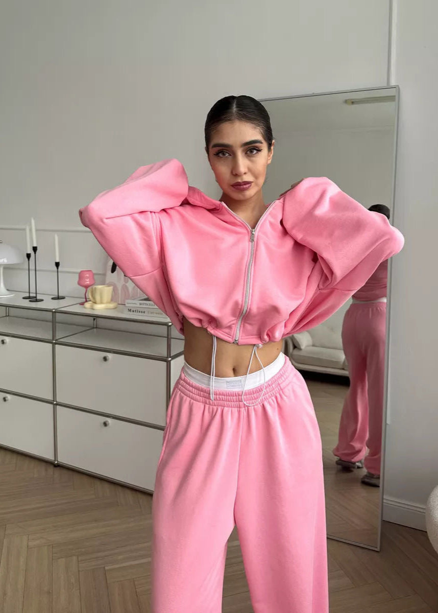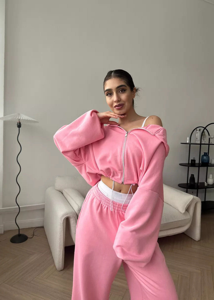 Bubblegum Pink Cropped Zip Hoodie and Wide-Leg Pants Set