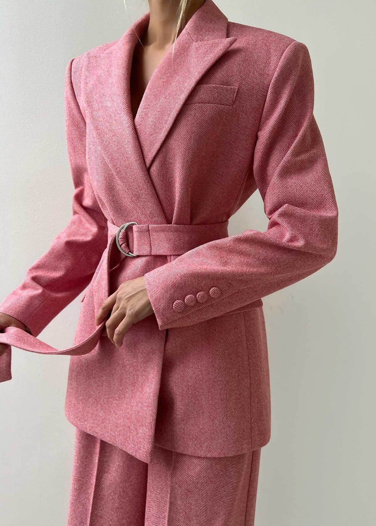 The Rosé Herringbone Blazer and Corset Jumpsuit Set pairs a sculpted bustier jumpsuit with a tailored belted blazer in a soft rose hue. The structured bodice, square neckline, and high-waist pleated trousers create a refined silhouette, while the matching blazer adds versatility for day or evening wear.