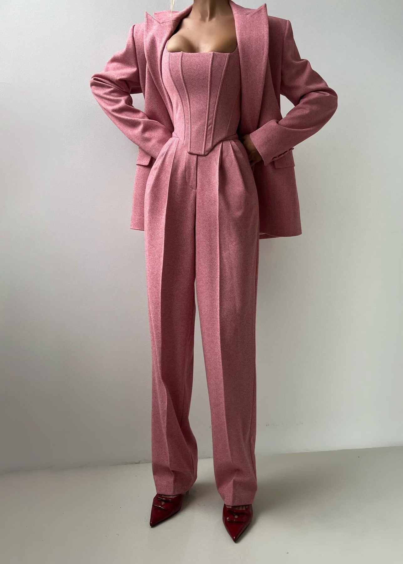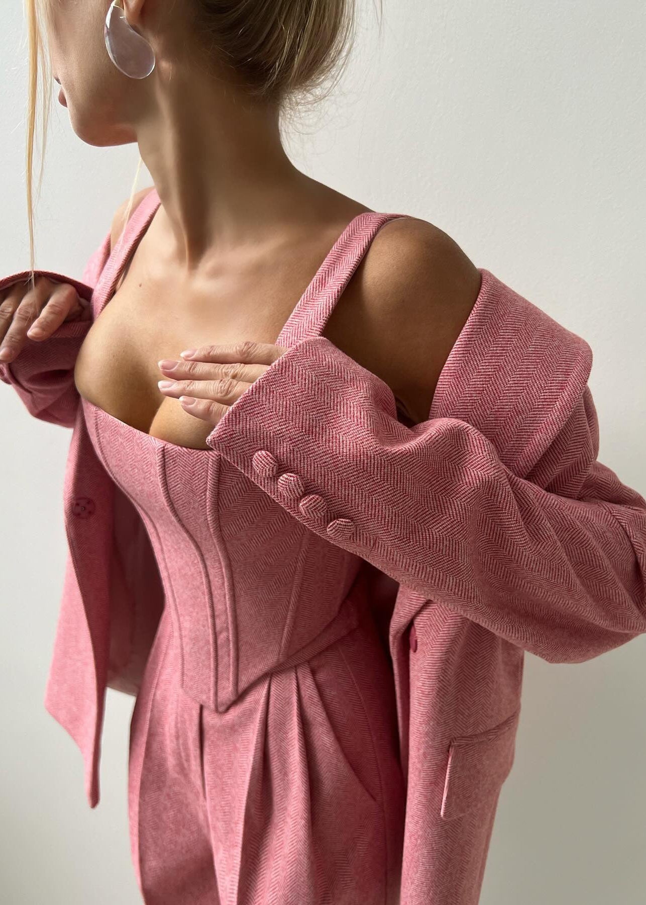 Rosé Herringbone Blazer and Corset Jumpsuit Set – Modern Two-Piece Suit for Women