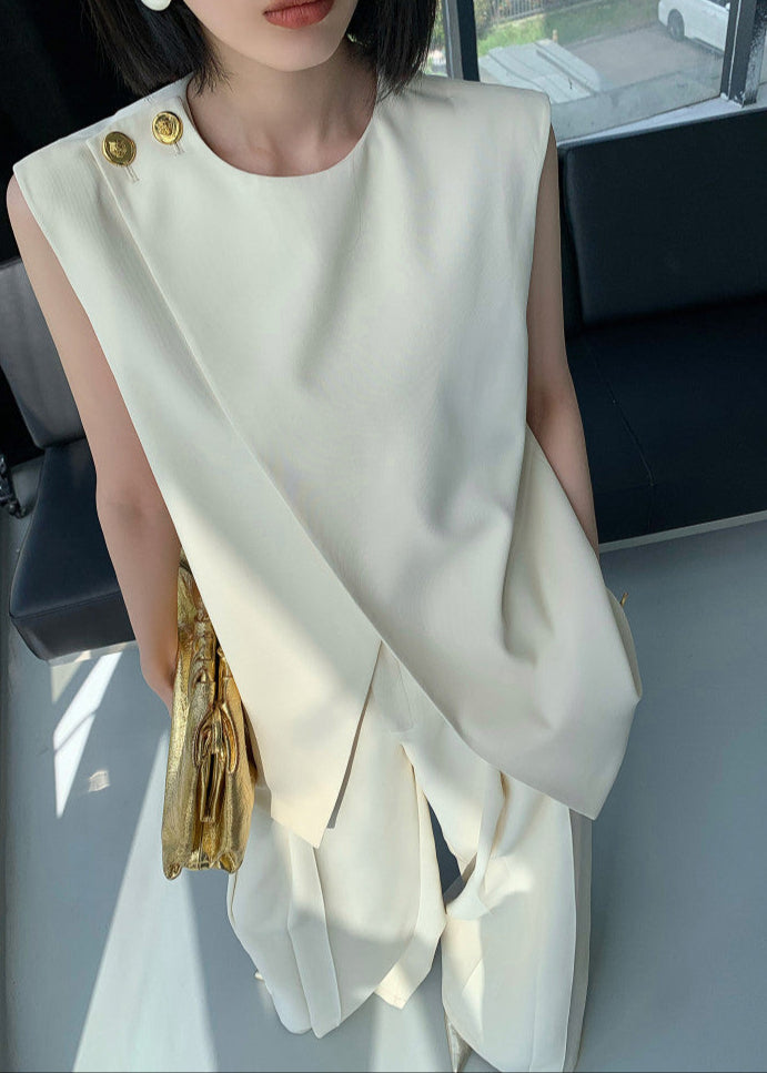 The Sculpted Edge Asymmetrical Top & Wide-Leg Pants Set redefines modern tailoring with sharp lines and soft drape. This sleeveless set features a sculptural overlay top with gold-tone buttons on the shoulder and a relaxed silhouette that flatters without effort. The high-waisted wide-leg trousers offer clean structure and movement with every step. Crafted from lightweight polyester, the ensemble blends architectural design with breathable comfort—perfect for gallery visits, rooftop dinners, or city getaways.
