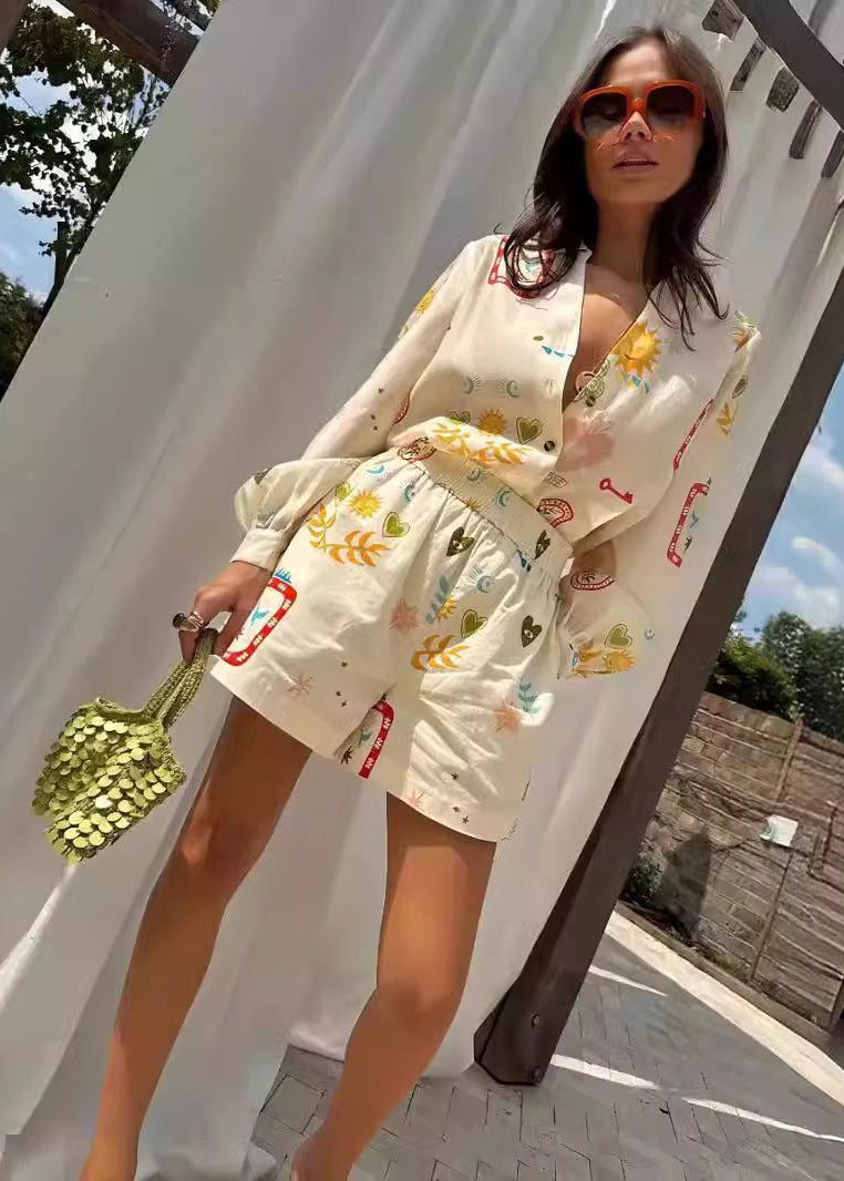 Solea is a playful two-piece set designed to bring joy to sunny days. Made from lightweight, breathable fabric, the set includes a relaxed-fit long sleeve button-down top and matching high-waisted shorts with an elastic waistband. The all-over print features whimsical motifs like hearts, keys, suns, moons, and florals in vibrant hues, creating a cheerful statement look.